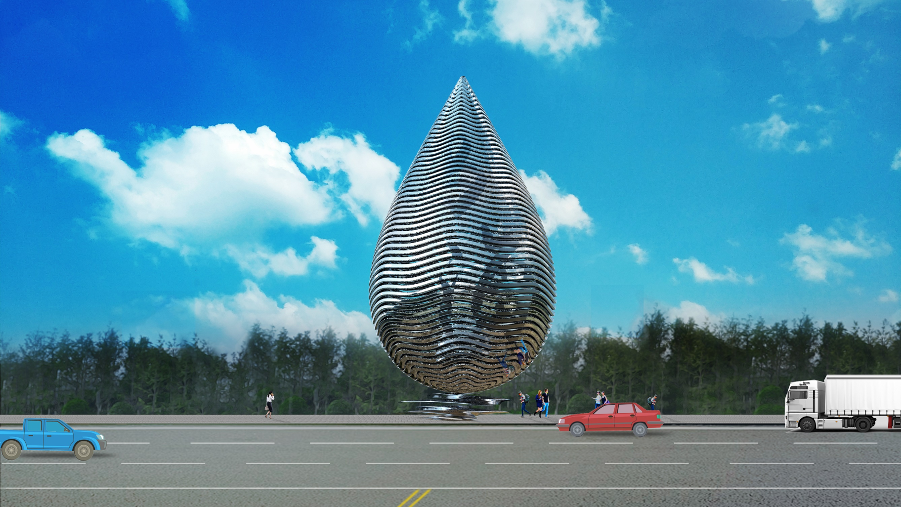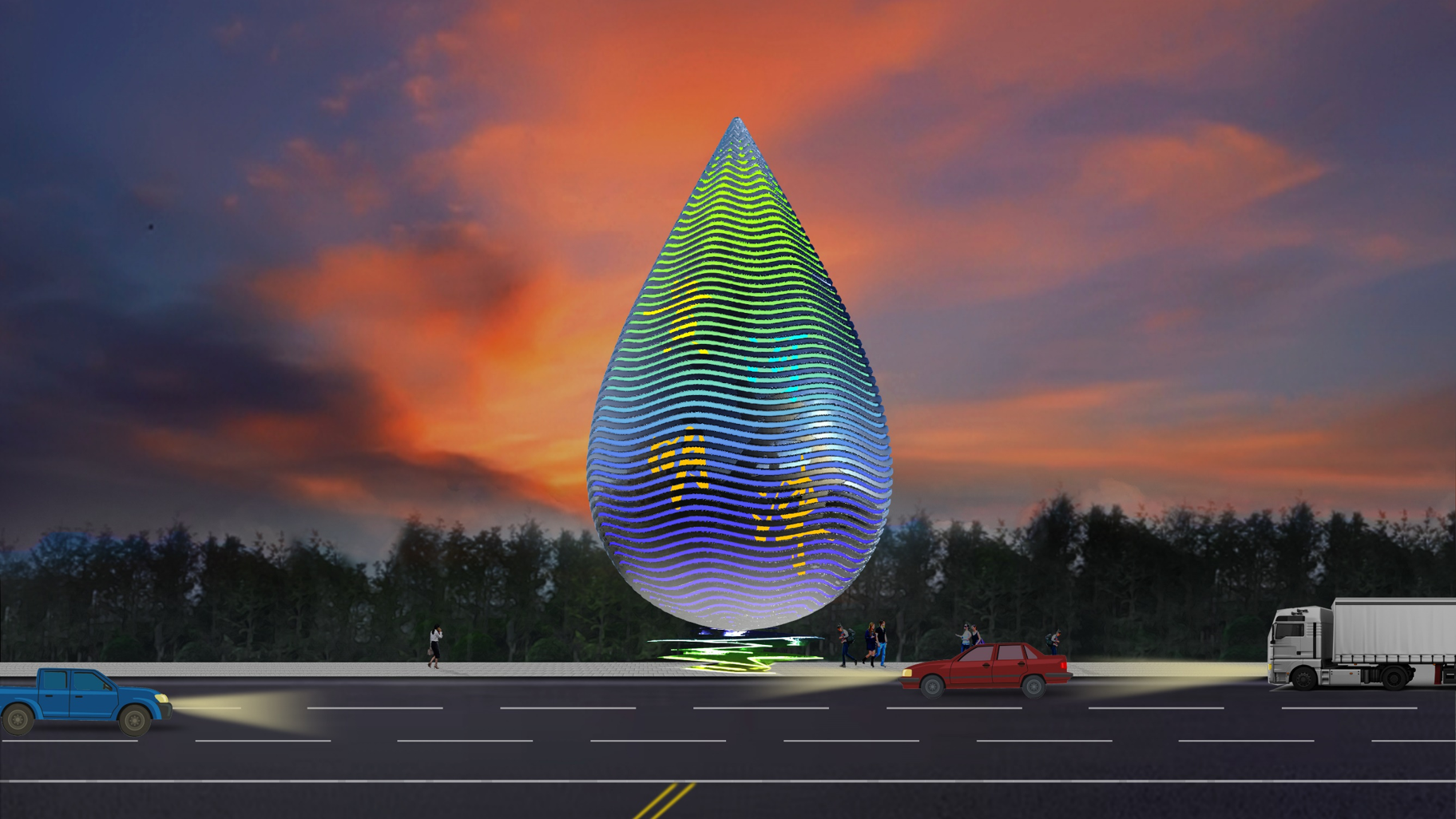 以晶莹剔透的水滴形式表现黄河明珠,恰如一颗宝石镶嵌在沙漠绿洲之中,碧水蓝天,璀璨夺目。