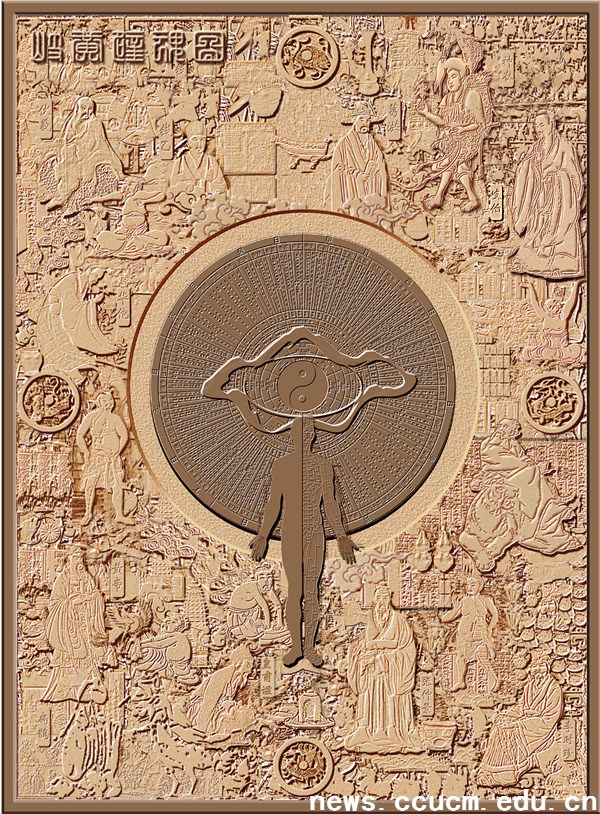 《岐黄壁魂图》设计起于2011年,作品创意由我校原校长王之虹教授发起,后经中国环境艺术委员会常委、知名雕塑艺术家李忠艺术设计,同时广泛征得校内外诸多领导、专家、学者的意见,几经修改、反复雕琢而成,现喷绘作品悬挂于四象城图书馆天井处。